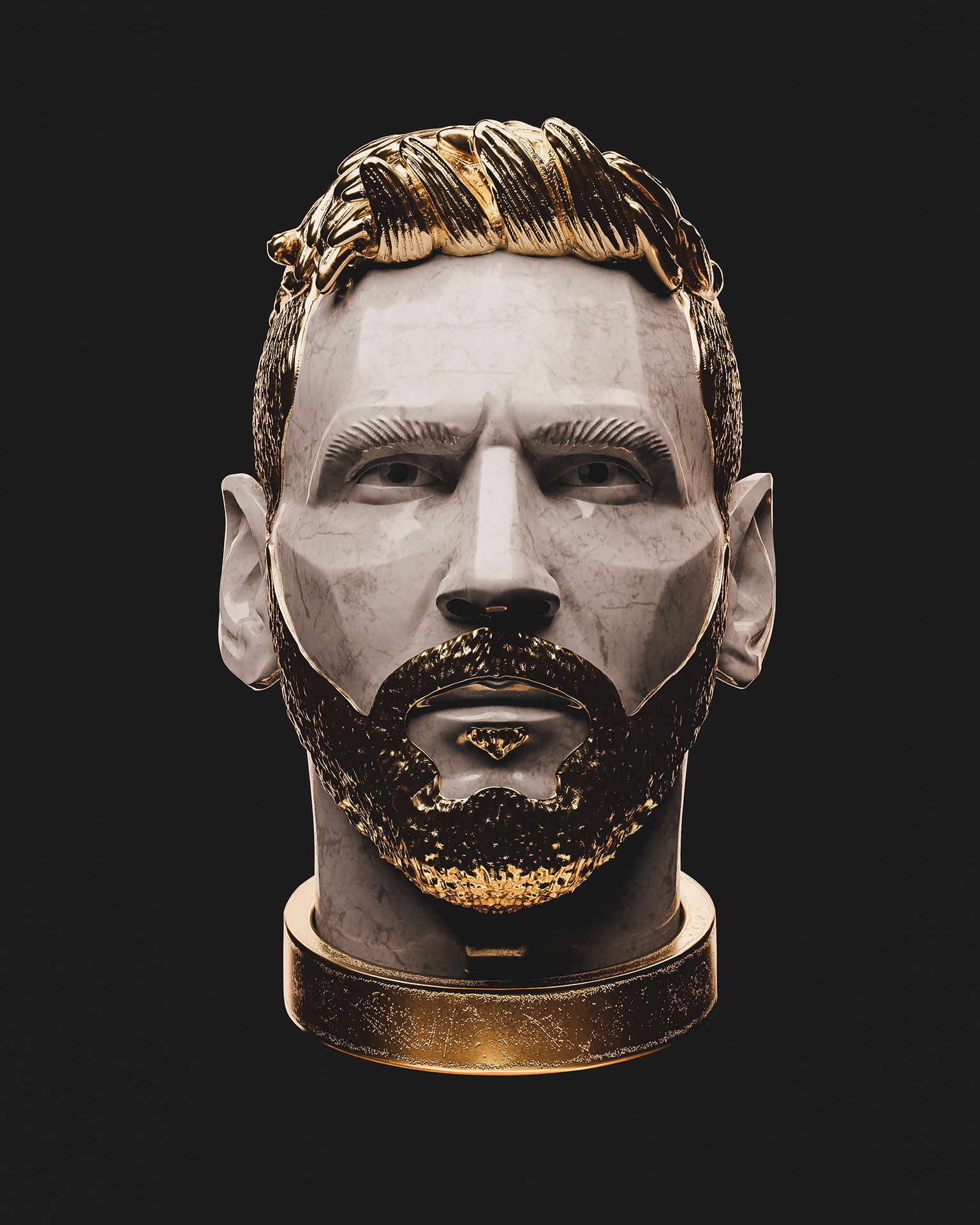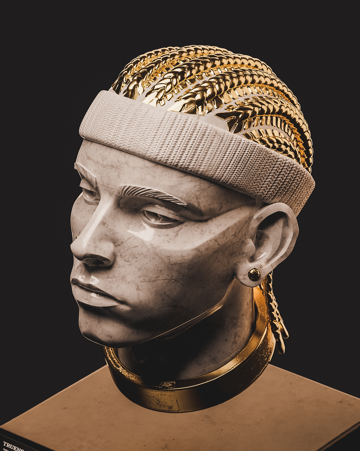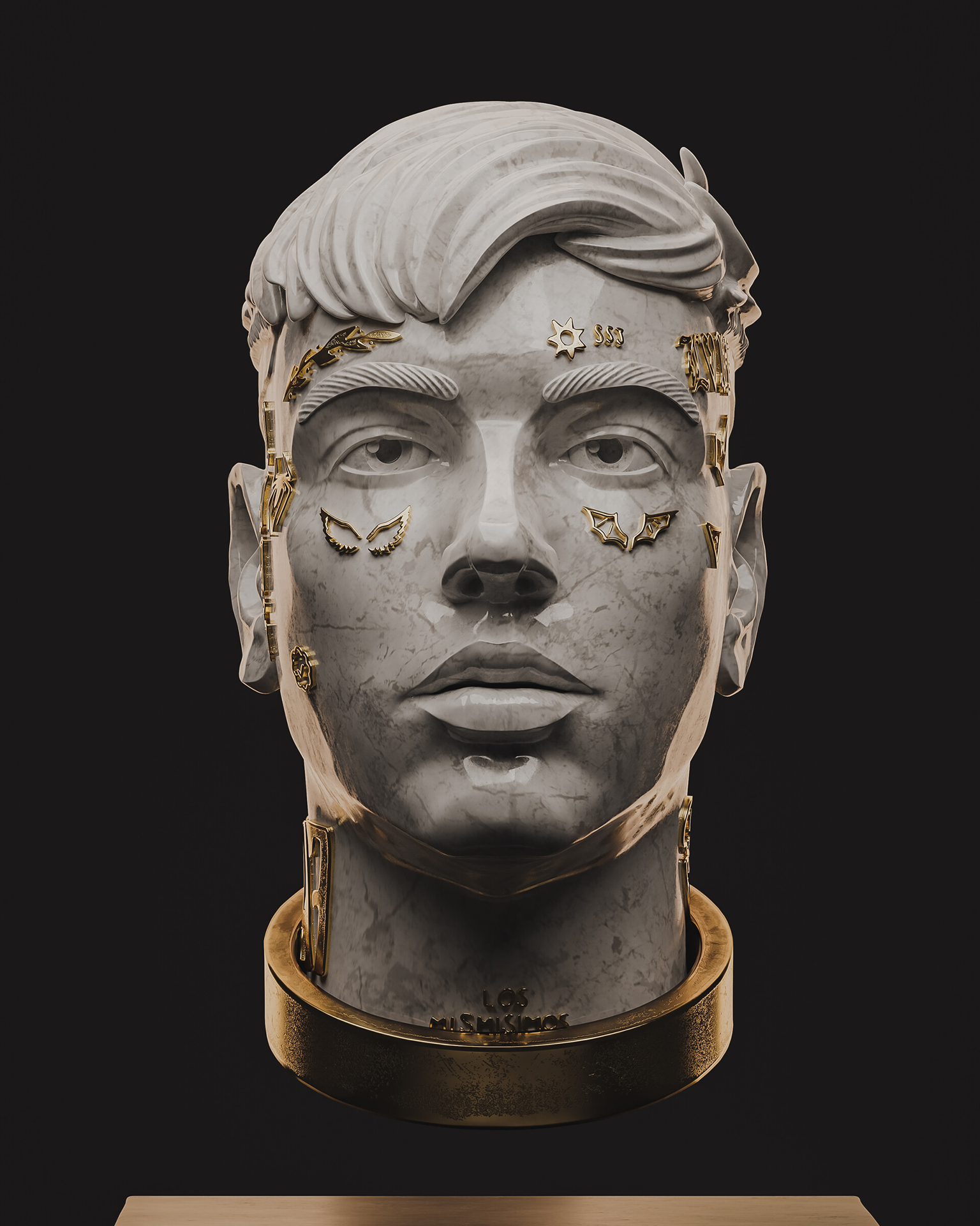 My style blends classical Renaissance sculpture aesthetics with baroque gold details, applied to contemporary figures that represent our cultural identity.