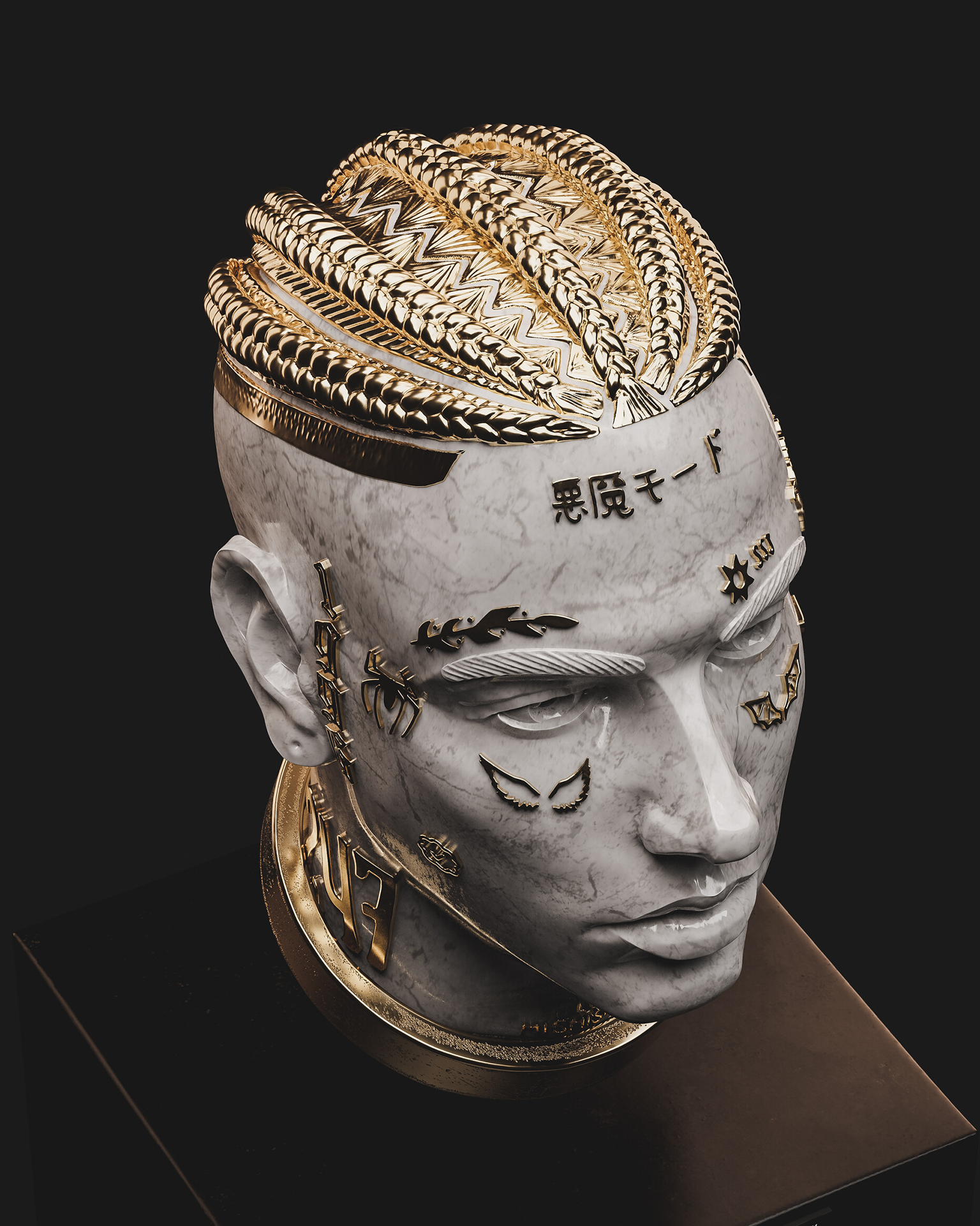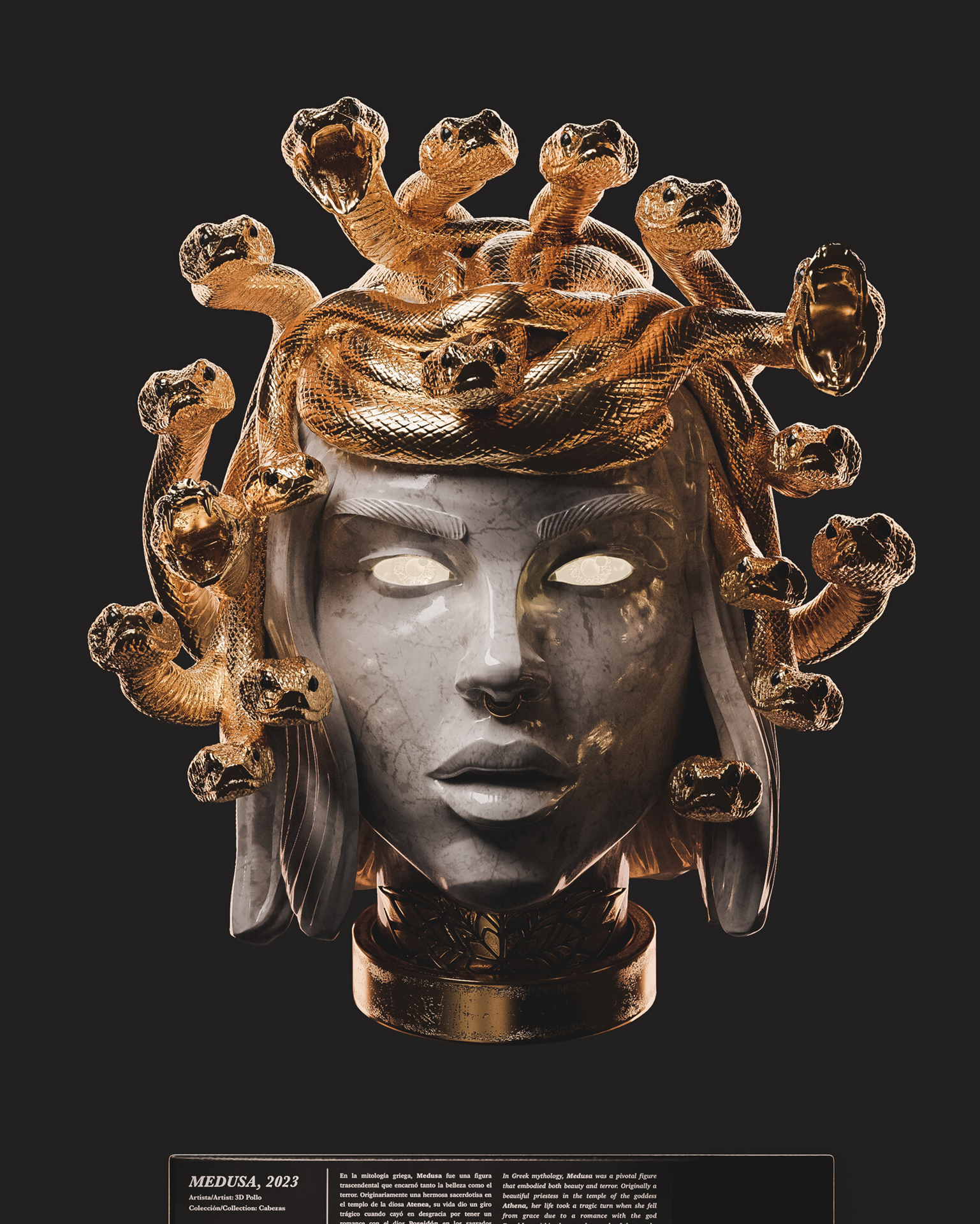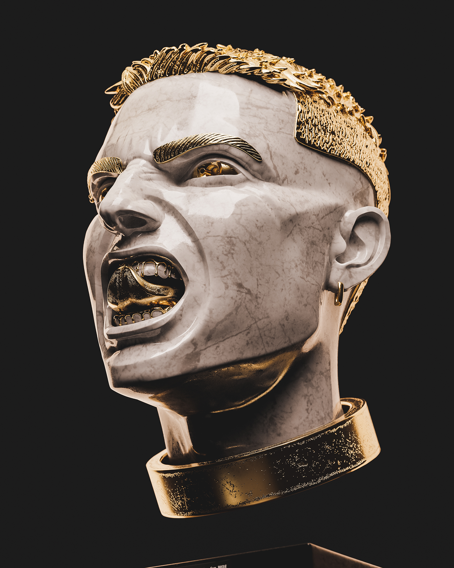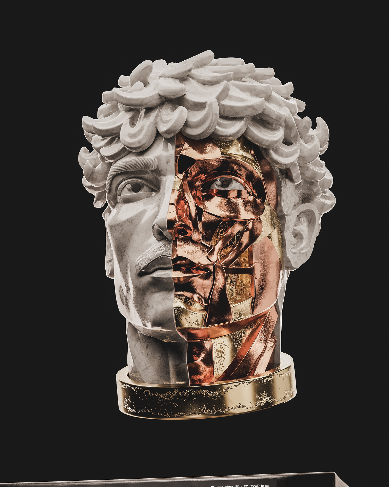 My style blends classical Renaissance sculpture aesthetics with baroque gold details, applied to contemporary figures that represent our cultural identity.